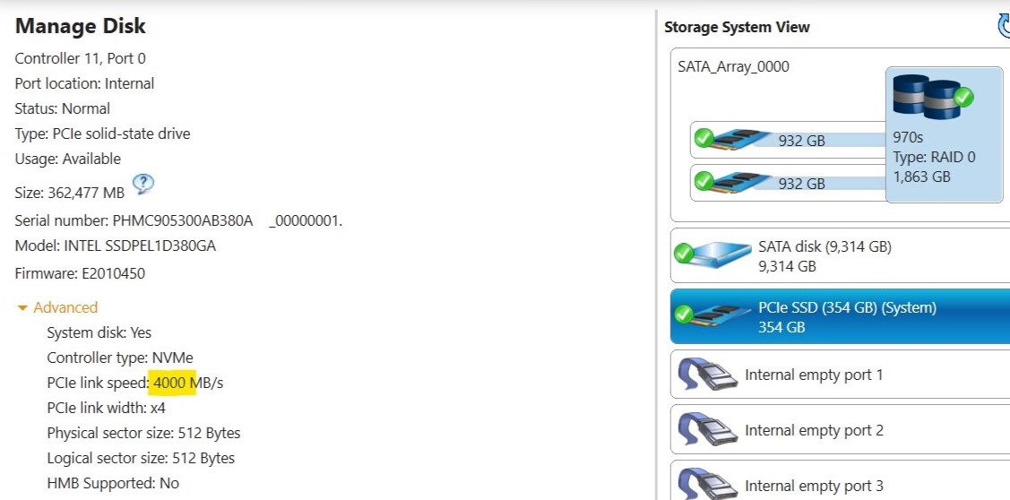 Since the performance wasn’t as per specs it seemed bottlenecked by something. I was really hard to tell by what exactly. Apart of tests, the only clue I had was IRST suite PCI speed. It showed PCIe link speed of 2000MB/s while it was expected to be 4000MB/s. I didn’t make a screenshot back then, but I have a screenshot only now with correct settings.
