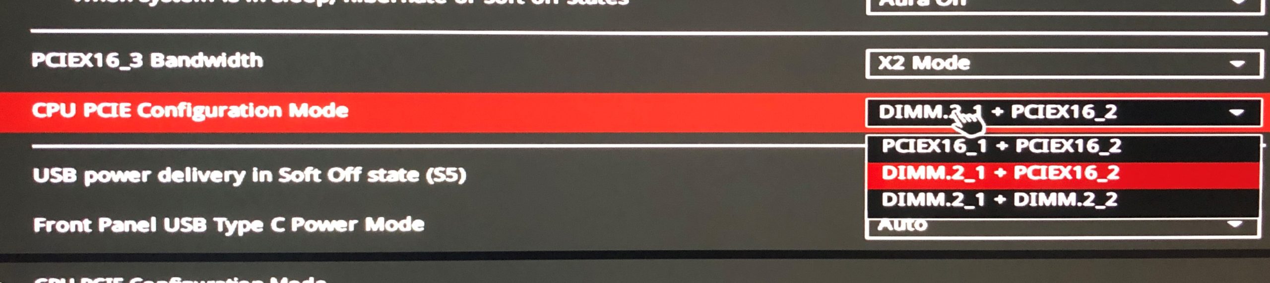 This time I didn’t need to move hardware around the motherboard. The installation required mounting SSD to DIMM.2 and attaching it to the motherboard. Simple. And a little BIOS adjustment to reroute CPU lines from GPU to DIMM.2.